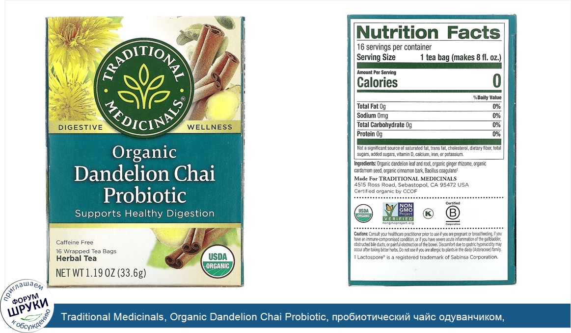 Друзья, если у вас есть отзыв/дополнение/комментарий/вопрос относительно Traditional Medicinals, Organic Dandelion Chai Probiotic, пробиотический чайс одуванчиком, 16чайных пакетиков, 33,6г (1,19унции) - напишите его ответом в эту тему (это будет полезно всему сообществу в целом и вам в отдельности).