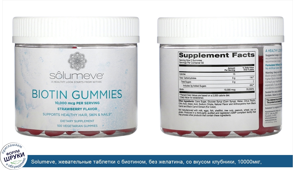 Друзья, если у вас есть отзыв/дополнение/комментарий/вопрос относительно Solumeve, жевательные таблетки с биотином, без желатина, со вкусом клубники, 10000мкг, 100вегетарианских жевательных таблеток - напишите его ответом в эту тему (это будет полезно всему сообществу в целом и вам в отдельности).