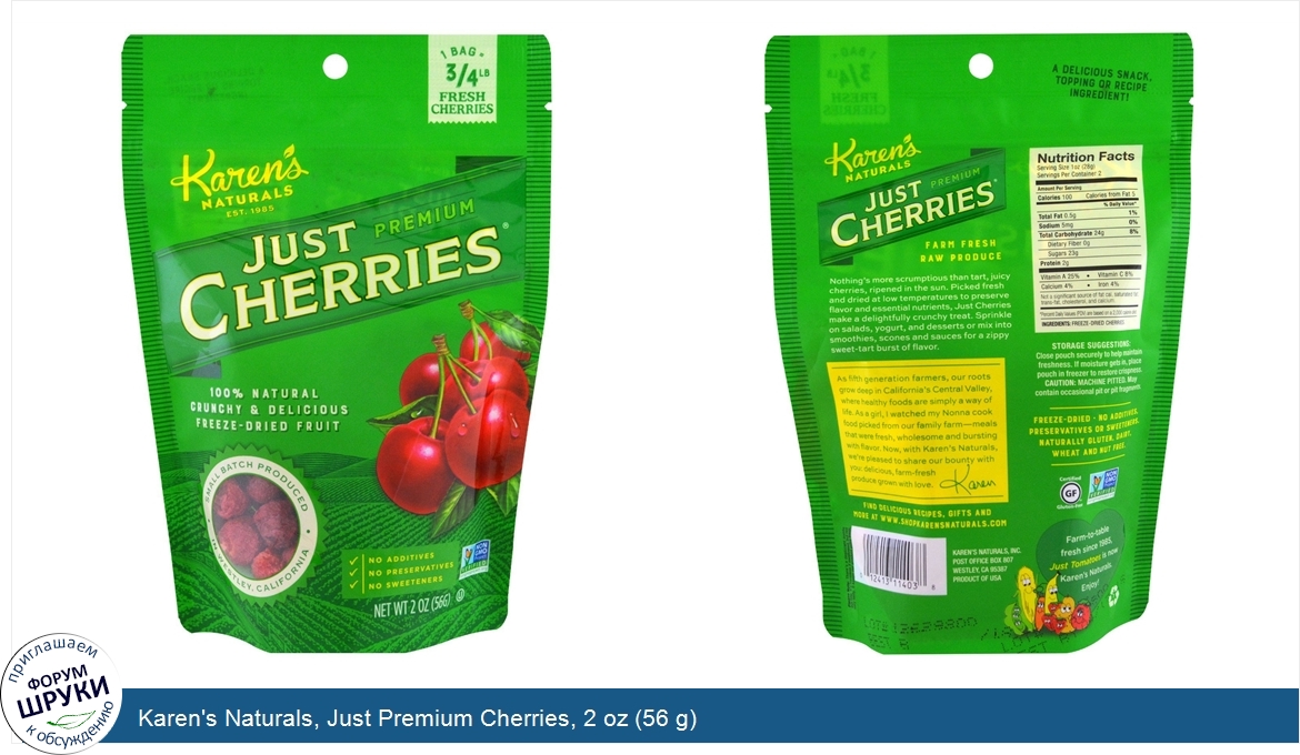 [DESCRIPT]1 Bag = 3/4 LB Fresh Cherries. Karen's Natural Est. 1985. 100% Natural. Crunchy Delicious. Freeze-Dried Fruit. Small Batch Produced in Westley California. No Additives. No Preservatives. No Sweeteners. Non GMO Project Verified. A Delicious Snack, Topping or Recipe Ingredient! . Farm Fresh. Raw Produce. No Additives, Preservatives or Sweeteners. Natural Gluten, Dairy, Wheat and Nut Free. Certified Gluten Free. Nothing's more scrumptious than tart, juice cherries, ripened in the sun. Picked fresh and dried at low temperatures to preserve flavor and essential nutrients, Just Cherries make a delightfully crunchy treat. Sprinkle on salads, yogurt, and desserts or mix into smoothies, scones and sauces for a zippy sweet-tart burst of flavor. As fifth generation farmers, our roots grow deep in California's Central Valley where healthy foods are simply a way of life. As a girl. I watch my Nonna cook food picked from our family farm- meals that were fresh, wholesome and bursting with flavor. Now, with Karen's Naturals, we're pleased to share our bounty with you: delicious, farm-fresh produce grown with love. - Karen. Farm-to-table fresh since 1985, Just Tomatoes is now Karen's Naturals. Enjoy![/DESCRIPT]... (описание дополняется)