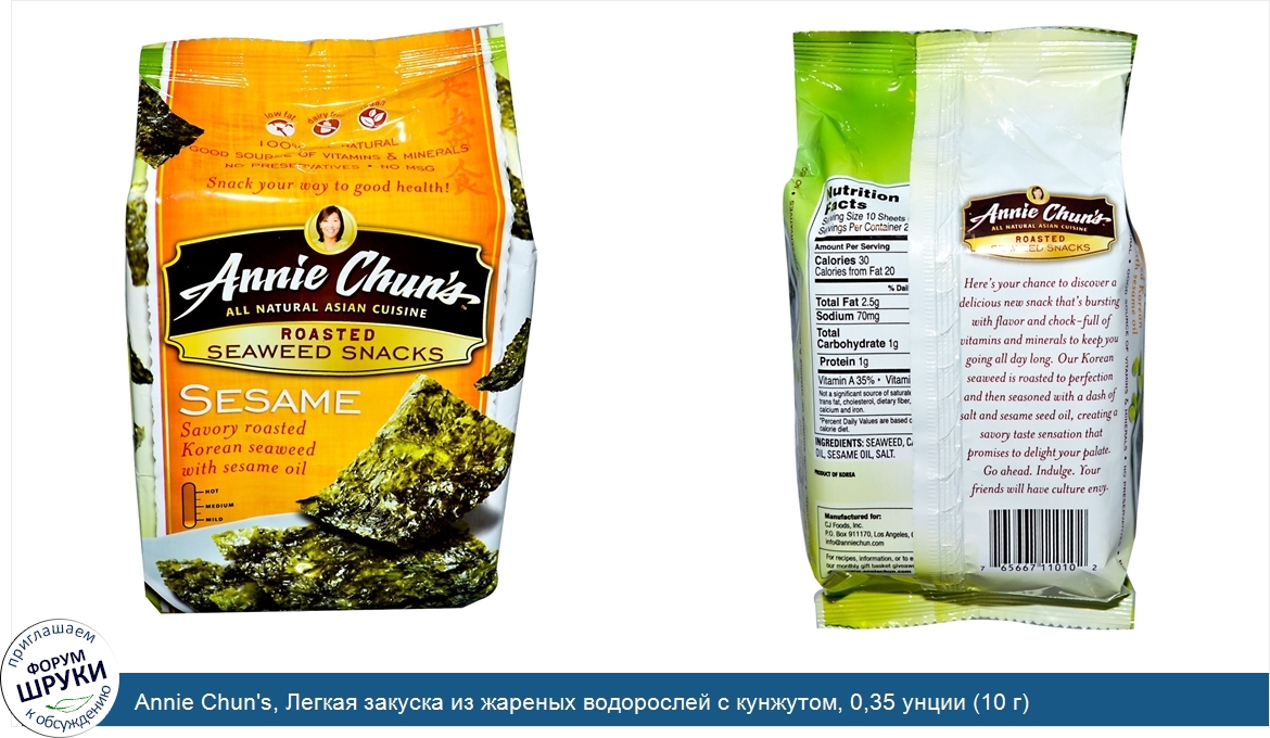 Друзья, если у вас есть отзыв/дополнение/комментарий/вопрос относительно Annie Chun's, Легкая закуска из жареных водорослей с кунжутом, 0,35 унции (10 г) - напишите его ответом в эту тему (это будет полезно всему сообществу в целом и вам в отдельности).