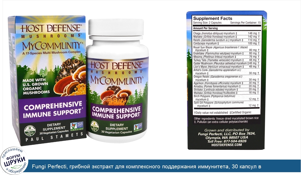 [DESCRIPT]A 17-Species Multi Mushroom Complex. Made with US Grown Organic Mushrooms. Certified Organic by the Washington State Department of Agriculture. Dietary Supplement. Non-GMO Project Verified. From the Forest, to our Farm, to You. MyCommunity is the 17 species Host Defense formula originally created by Paul Stamets - the most comprehensive Host Defense capsule formula for Supporting Natural Immunity. Host Defense MyCommunity. MyCommunity uses activated, freeze-dried, Certified Organic mycelium and fruitbodies, with a full spectrum of constituents: polysaccharides (beta glucans, arabinoxylane, glucose, xylose, galactose and cordycepic acid), glycoproteins, ergosterols, triterpenoids and other myco-nutrients, which are essential for Supporting Natural Immunity. Host Defense is the #1 Best-Selling Mushroom Brand in the US^. Identity Guaranteed – Guaranteed, Accurate Identity of Each Mushroom. Made with Certified Organic Ingredients. Non-GMO Verified Ingredients. Heat treated to proper temperature to ensure safety bioavailability. US Grown and Processed. Produced Under the Direct Supervision of Paul Stamets, D.Sc. Bee Friendly. ^. Source: SPINSscan Natural / Natural Products Supermarkets >$2MM / Total US – Natural Channel / Mushrooms Ingredient Report / 52 Wks Ending 3/22/2015.[/DESCRIPT]... (описание дополняется)