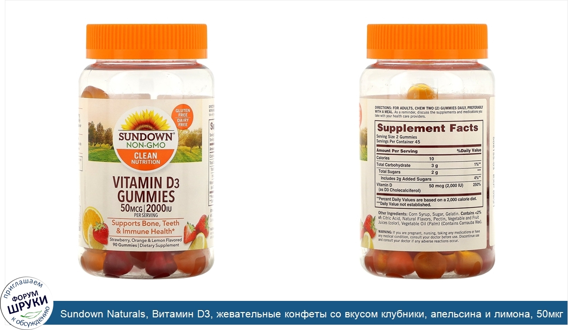 Друзья, если у вас есть отзыв/дополнение/комментарий/вопрос относительно Sundown Naturals, Витамин D3, жевательные конфеты со вкусом клубники, апельсина и лимона, 50мкг (2000МЕ), 90 жевательных конфет - напишите его ответом в эту тему (это будет полезно всему сообществу в целом и вам в отдельности).