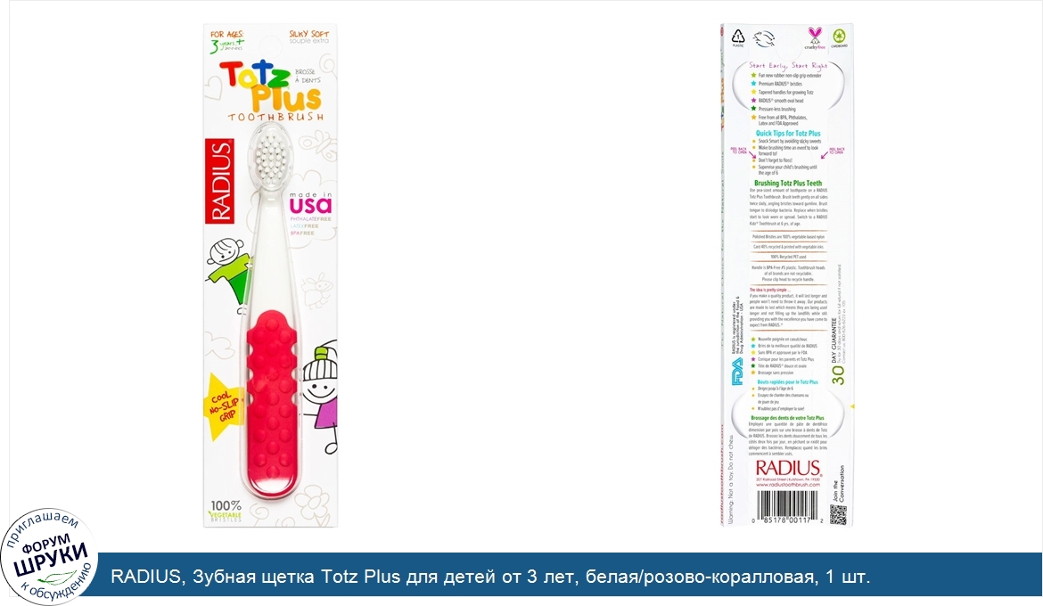 Друзья, если у вас есть отзыв/дополнение/комментарий/вопрос относительно RADIUS, Зубная щетка Totz Plus для детей от 3 лет, белая/розово-коралловая, 1 шт. - напишите его ответом в эту тему (это будет полезно всему сообществу в целом и вам в отдельности).