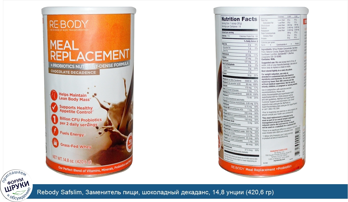 Друзья, если у вас есть отзыв/дополнение/комментарий/вопрос относительно Rebody Safslim, Заменитель пищи, шоколадный декаданс, 14,8 унции (420,6 гр) - напишите его ответом в эту тему (это будет полезно всему сообществу в целом и вам в отдельности).