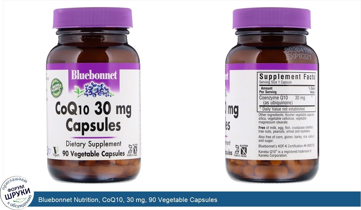Made with Non-GMO Ingredients. Kaneka-Q10. Vegan. Dietary Supplement. Kosher Parve. Gluten Free. Bluebonnet's CoQ10 30 mg Capsules provide 100% "natural trans-isomer" coenzyme Q10. Available in easy-to-swallow ve...