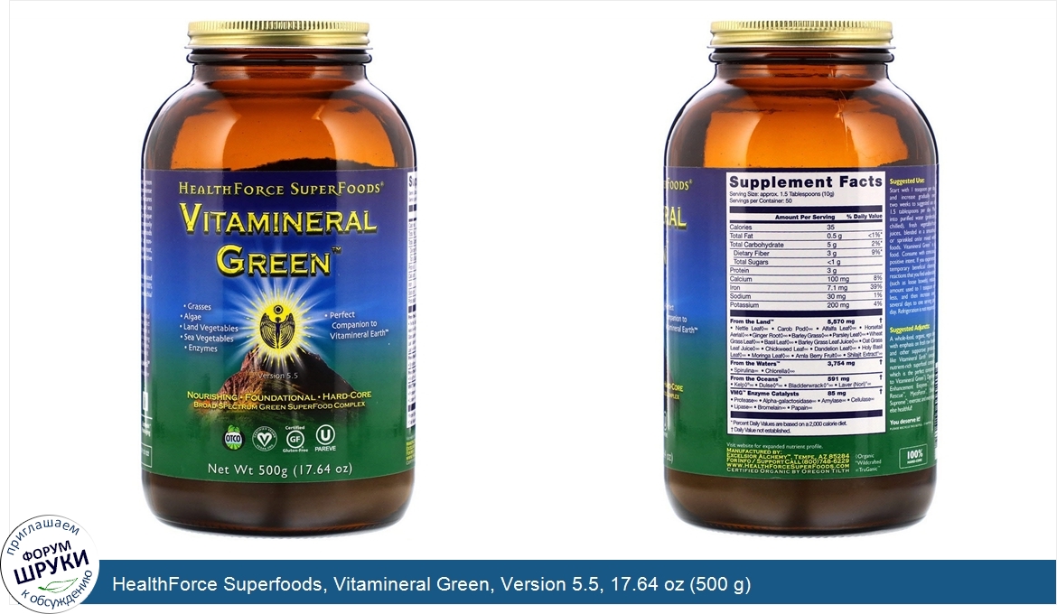 [DESCRIPT]Grasses. Algae. Land Vegetables. Sea Vegetables. Enzymes. Perfect Companion to Vitamineral Earth. Nourishing. Foundational. Hard-Core. Broad-Spectrum Green SuperFood Complex. Certified Vegan. Certified Gluten-Free. Kosher Pareve. Certified Organic by Oregon Tilth. You Deserve It! TruGanic Sourcing. Eco Facility. Vegan Ethics. Lab Verified. EcoFresh Packaging. Vitamineral Green is an extremely potent, hard-core, green superfood complex, combining 25 of the most nutrient-dense superfoods on the planet in an easy-to-use powder. Features alkalizing grasses and grass juices, freshwater algae, and sea vegetables loaded with iodine and trace minerals. Our unique formula offers a diverse blend of plant foods not commonly found in our modern diet. By including bio-diverse superfoods like nettles, horsetail, and moringa leaf, as well as non-green powerhouse superfoods like amla berry, ginger root, and shilakit, we've created a broad-spectrum, bio-nutritive superfood complex that is truly one of a kind. Vitamineral Green is actual food, free of synthetic/isolated nutrients. No binders, fillers, or added sweeteners. 100% Green Focused: Not diluted with grains, legumes, seeds/chia/flax, fibers, fruits, or fillers. HealthForce SuperFoods® is a grassroots, independently owned and operated whole food botanical company. We offer a diverse and truly effective product line inspired by the incredible symbiotic power of plants. Our mission is fueled by a passion for purity and heart-centered collaboration, with a strong commitment to compassion and integrity. We are proud to offer clean, ethically produced products designed to help you thrive in a modern world. "I wish you great health and happiness always. !". -Dr. Jameth Sheridan - Naturopath and Hard-Core Herbal Medicine Researcher[/DESCRIPT]... (описание дополняется)