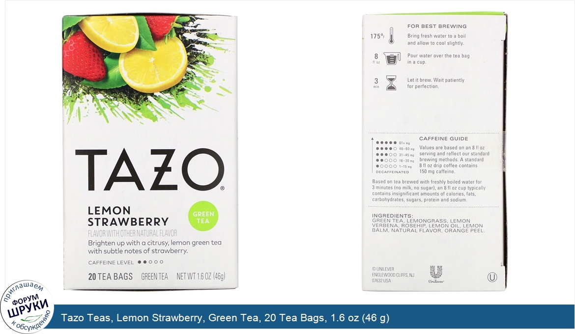 Друзья, если у вас есть отзыв/дополнение/комментарий/вопрос относительно Tazo Teas, Lemon Strawberry, Green Tea, 20 Tea Bags, 1.6 oz (46 g) - напишите его ответом в эту тему (это будет полезно всему сообществу в целом и вам в отдельности).
