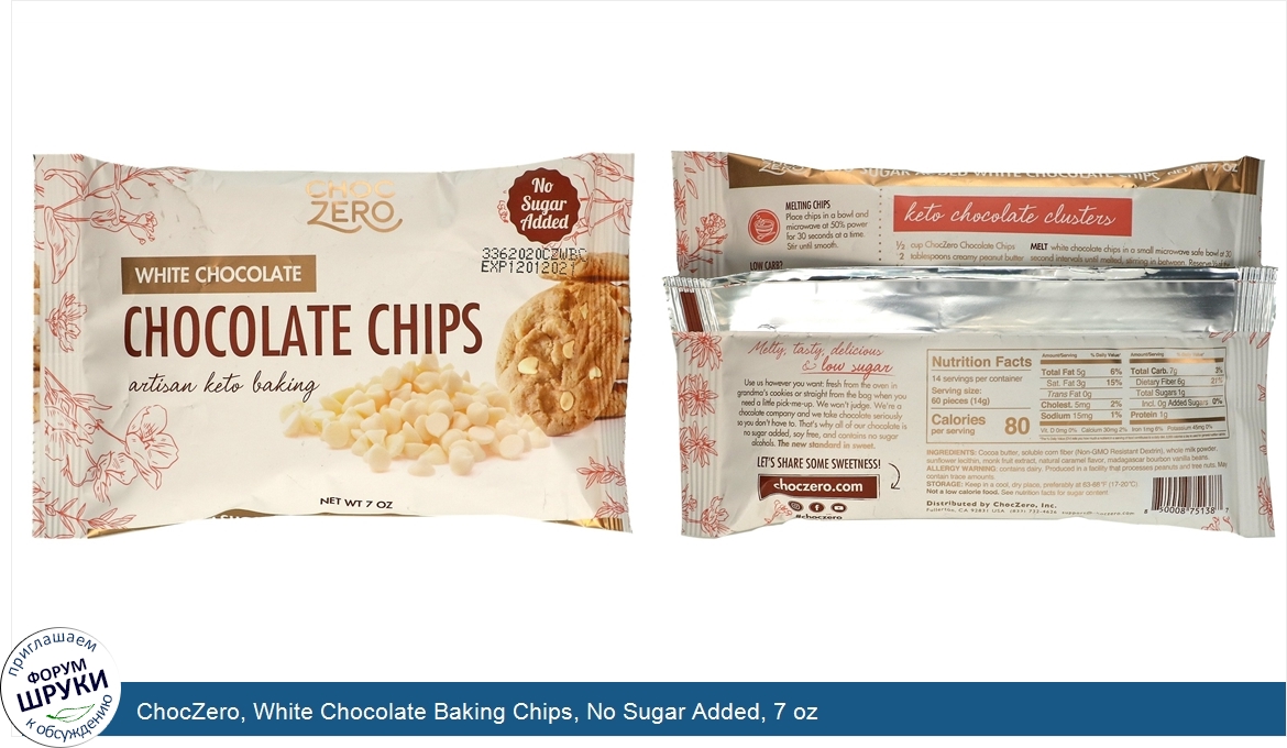 ChocZero, White Chocolate Baking Chips, No Sugar Added, 7 oz