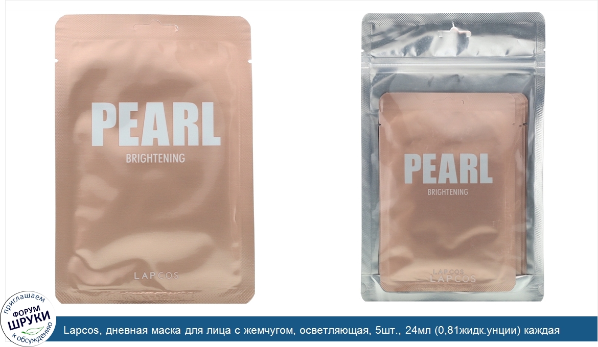 Lapcos, дневная маска для лица с жемчугом, осветляющая, 5шт., 24мл (0,81жидк.унции) каждая