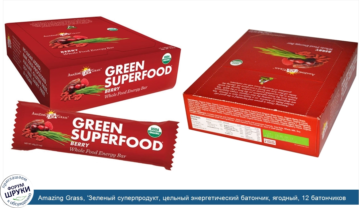 Друзья, если у вас есть отзыв/дополнение/комментарий/вопрос относительно Amazing Grass, 'Зеленый суперпродукт, цельный энергетический батончик, ягодный, 12 батончиков по 2.1 унций (60 г) - напишите его ответом в эту тему (это будет полезно всему сообществу в целом и вам в отдельности).