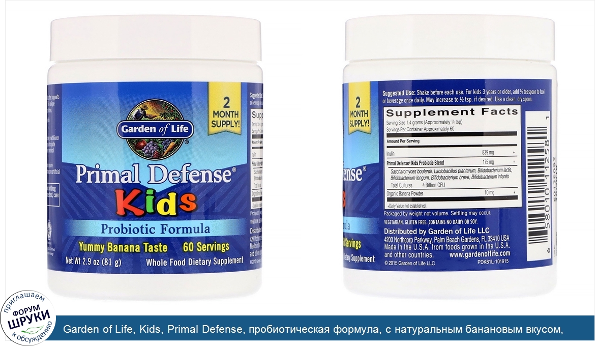 Друзья, если у вас есть отзыв/дополнение/комментарий/вопрос относительно Garden of Life, Kids, Primal Defense, пробиотическая формула, с натуральным банановым вкусом, 81 г (2,9 унции) - напишите его ответом в эту тему (это будет полезно всему сообществу в целом и вам в отдельности).