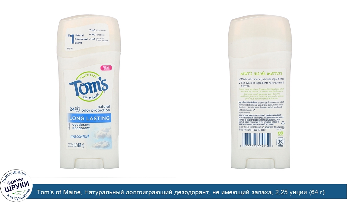 Друзья, если у вас есть отзыв/дополнение/комментарий/вопрос относительно Tom's of Maine, Натуральный долгоиграющий дезодорант, не имеющий запаха, 2,25 унции (64 г) - напишите его ответом в эту тему (это будет полезно всему сообществу в целом и вам в отдельности).