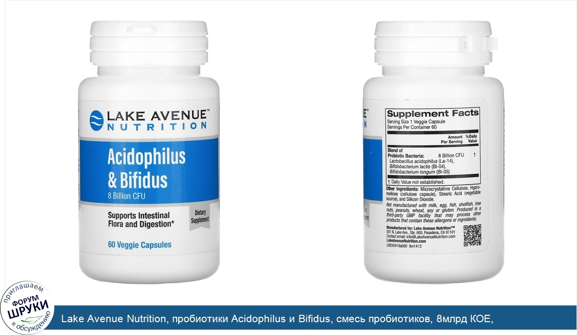 . Lake Avenue Nutrition,. пробиотики Acidophilus и Bifidus. Смесь пробиотиков, 8 млрд КОЕ. Поддерживает здоровье кишечной флоры и нормальное пищеварение*. Продукт доступен в упаковках по 60 и 180 растительных кап...