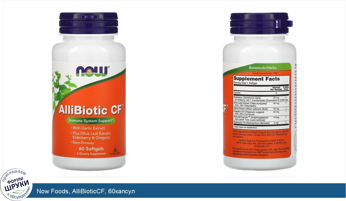 [DESCRIPT]Поддержка иммунной системы. С экстрактом чеснока. С экстрактом оливковых листьев, бузиной и орегано. Не вызывает сонливости. Пищевая добавка. Кошерный продукт. Содержит желатин. Натуральные растения и травы. Семейное предприятие, основанное в 1968 году. Произведено на предприятии, имеющем регистрацию текущей надлежащей производственной практики (GMP). AlliBiotic CF™от NOW® — это растительная смесь, созданная для укрепления иммунитета. Эта растительная формула содержит экстракт чеснока, который веками использовался для укрепления здоровья. Кроме того, это универсальное средство также содержит бузину, экстракт оливковых листьев и масло орегано. В качестве пребиотической добавки в состав этого продукта входит ImmunEnhancer™, неперевариваемая растворимая клетчатка из лиственницы, которая поддерживает здоровую кишечную флору — одну из основных составляющих для нормальной работы иммунной системы.[/DESCRIPT]... (описание дополняется)