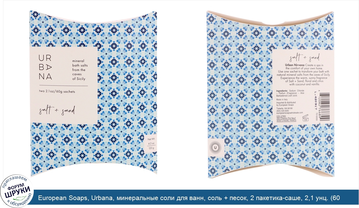 Друзья, если у вас есть отзыв/дополнение/комментарий/вопрос относительно European Soaps, Urbana, минеральные соли для ванн, соль + песок, 2 пакетика-саше, 2,1 унц. (60 г) каждый - напишите его ответом в эту тему (это будет полезно всему сообществу в целом и вам в отдельности).