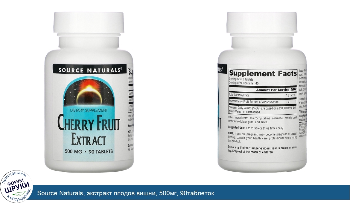 Друзья, если у вас есть отзыв/дополнение/комментарий/вопрос относительно Source Naturals, экстракт плодов вишни, 500мг, 90таблеток - напишите его ответом в эту тему (это будет полезно всему сообществу в целом и вам в отдельности).