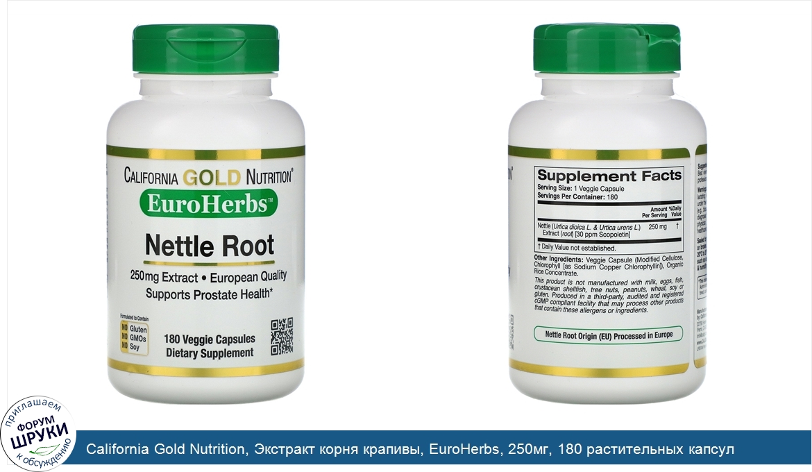 California Gold Nutrition, Экстракт корня крапивы, EuroHerbs, 250мг, 180 растительных капсул