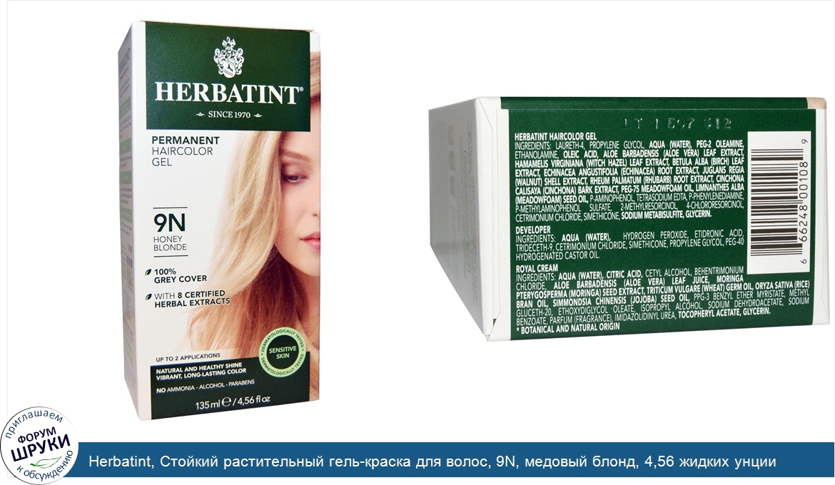 Друзья, если у вас есть отзыв/дополнение/комментарий/вопрос относительно Herbatint, Стойкий растительный гель-краска для волос, 9N, медовый блонд, 4,56 жидких унции (135 мл) - напишите его ответом в эту тему (это будет полезно всему сообществу в целом и вам в отдельности).