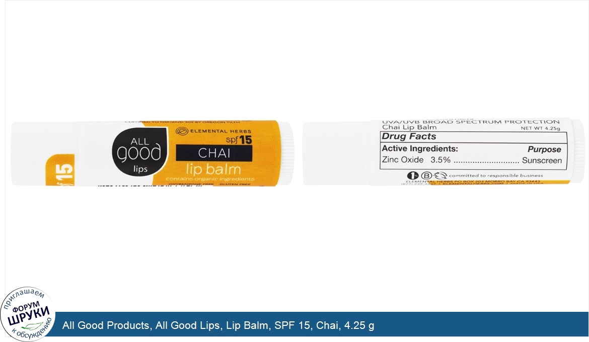 Друзья, если у вас есть отзыв/дополнение/комментарий/вопрос относительно All Good Products, All Good Lips, Lip Balm, SPF 15, Chai, 4.25 g - напишите его ответом в эту тему (это будет полезно всему сообществу в целом и вам в отдельности).