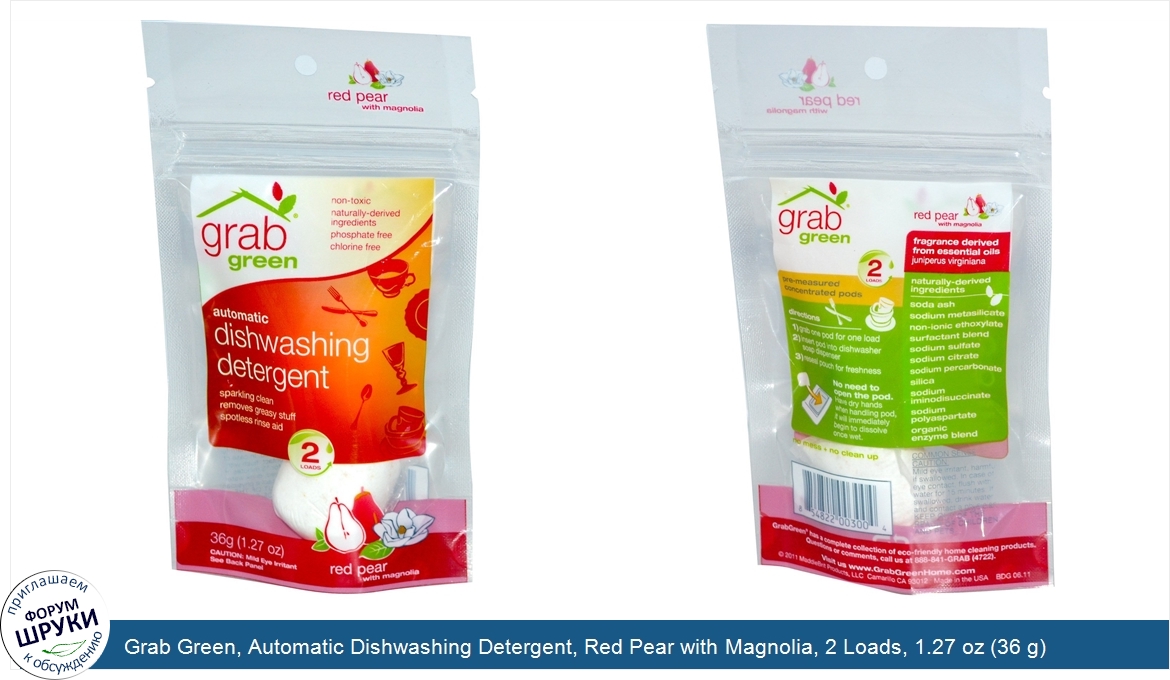 Grab Green, Automatic Dishwashing Detergent, Red Pear with Magnolia, 2 Loads, 1.27 oz (36 g)