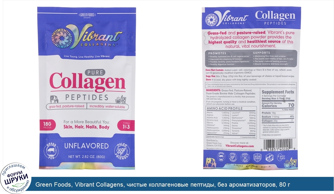 Друзья, если у вас есть отзыв/дополнение/комментарий/вопрос относительно Green Foods, Vibrant Collagens, чистые коллагеновые пептиды, без ароматизаторов, 80 г - напишите его ответом в эту тему (это будет полезно всему сообществу в целом и вам в отдельности).