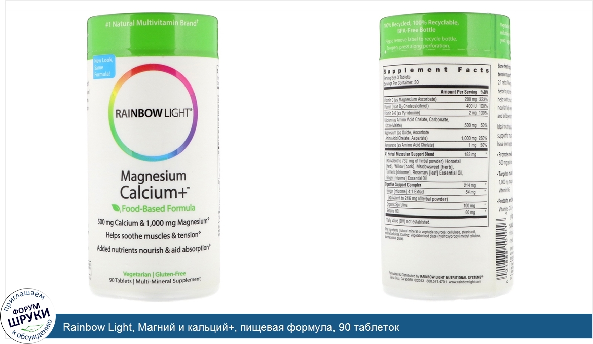 Друзья, если у вас есть отзыв/дополнение/комментарий/вопрос относительно Rainbow Light, Магний и кальций+, пищевая формула, 90 таблеток - напишите его ответом в эту тему (это будет полезно всему сообществу в целом и вам в отдельности).