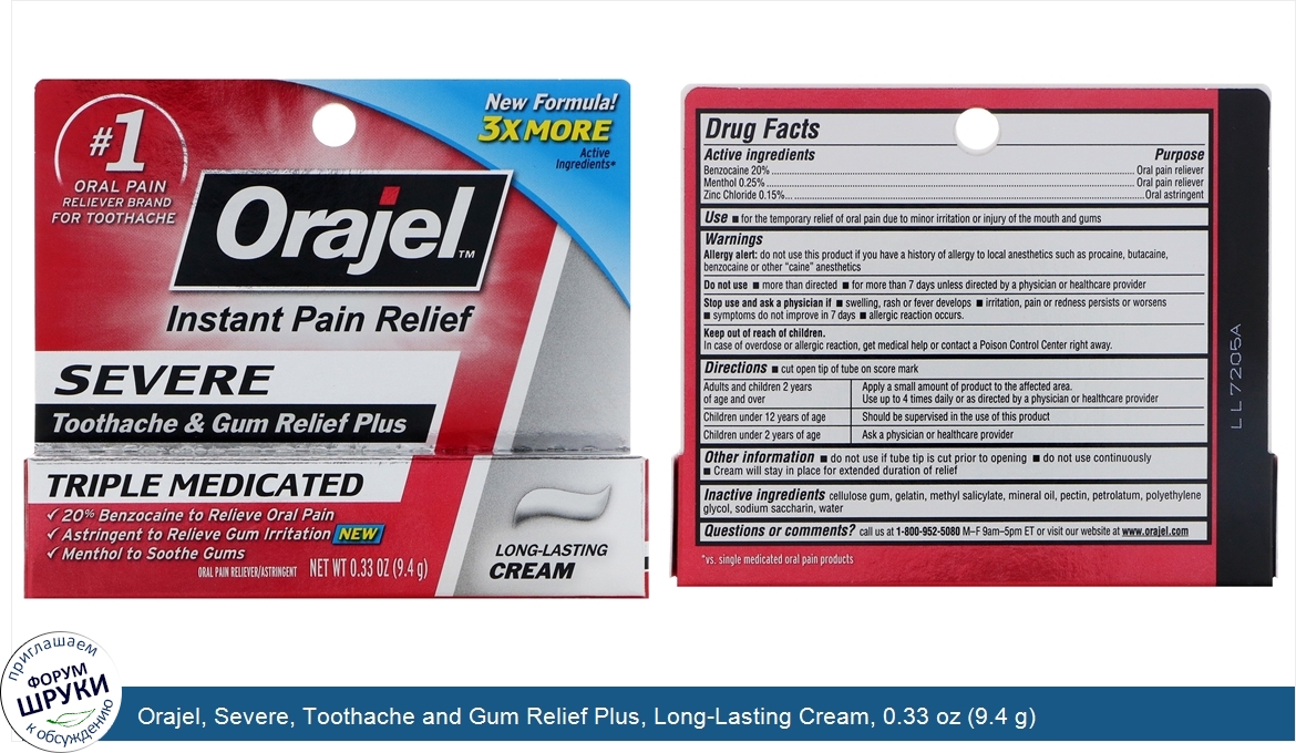Друзья, если у вас есть отзыв/дополнение/комментарий/вопрос относительно Orajel, Severe, Toothache and Gum Relief Plus, Long-Lasting Cream, 0.33 oz (9.4 g) - напишите его ответом в эту тему (это будет полезно всему сообществу в целом и вам в отдельности).