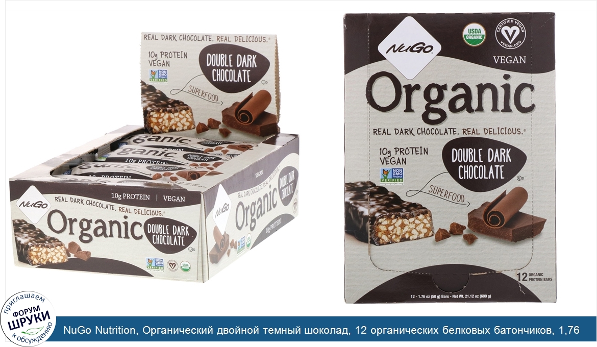 NuGo Nutrition, Органический двойной темный шоколад, 12 органических белковых батончиков, 1,76 унции (50 г) каждый