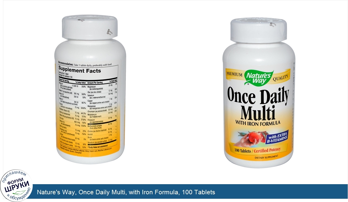 Друзья, если у вас есть отзыв/дополнение/комментарий/вопрос относительно Nature's Way, Once Daily Multi, with Iron Formula, 100 Tablets - напишите его ответом в эту тему (это будет полезно всему сообществу в целом и вам в отдельности).