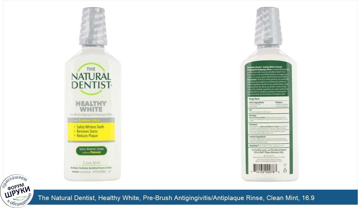 [DESCRIPT]With Bamboo Silica. Safely Whitens Teeth. Reduces Plaque. Safely Removes Stains without Peroxide. No Bleach, No Alcohol, No Artificial Flavors or Colors. Vegan. Not Tested on Animals. The Natural Dentist Healthy White Pre-Brush Antigingivitis/Antiplaque Rinse is scientifically formulated to whiten your teeth naturally and without bleach. Since this product is to be used before brushing, we suggest you continue to use your regular after-brushing rinse as before. Our Promise: The Natural Dentist products are scientifically formulated using carefully sourced botanical, herbal and mineral ingredients. We will not use synthetic flavors, colors, or preservatives. Nor will we use alcohol or sodium lauryl sulfate (SLS). Synthetic ingredients are used in certain of our products when no satisfactory substitute can be found in nature that meets our formulation or therapeutic goals. Uses. : Helps prevent gingivitis and reduce plaque.[/DESCRIPT]... (описание дополняется)