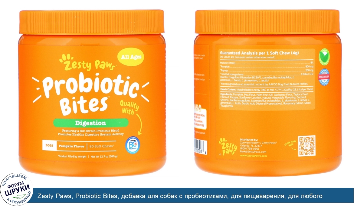 Друзья, если у вас есть отзыв/дополнение/комментарий/вопрос относительно Zesty Paws, Probiotic Bites, добавка для собак с пробиотиками, для пищеварения, для любого возраста, со вкусом тыквы, 90мягких жевательных таблеток - напишите его ответом в эту тему (это будет полезно всему сообществу в целом и вам в отдельности).