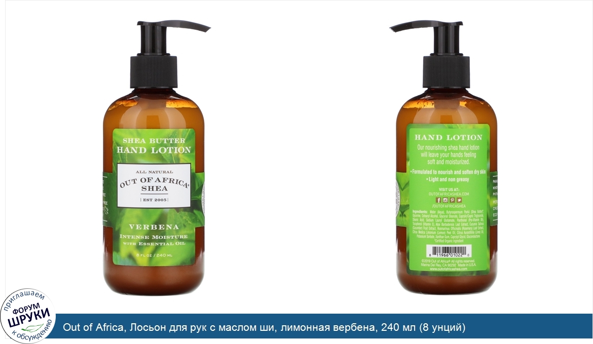 Out of Africa, Лосьон для рук с маслом ши, лимонная вербена, 240 мл (8 унций)