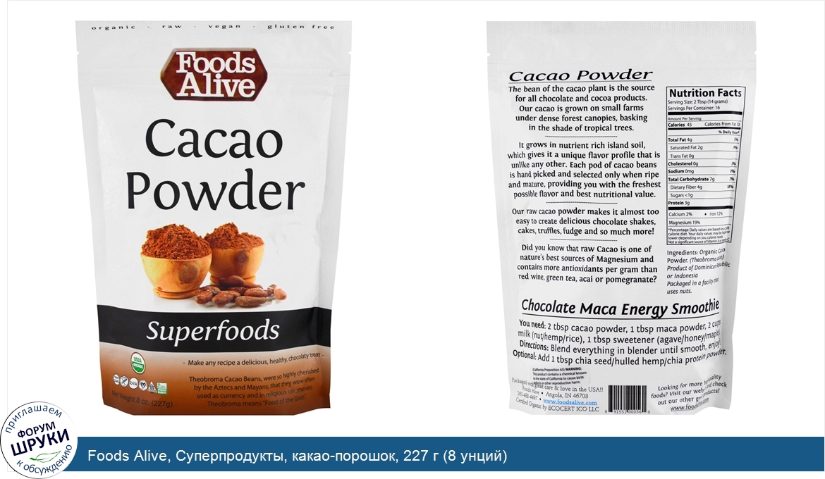 Друзья, если у вас есть отзыв/дополнение/комментарий/вопрос относительно Foods Alive, Суперпродукты, какао-порошок, 227 г (8 унций) - напишите его ответом в эту тему (это будет полезно всему сообществу в целом и вам в отдельности).