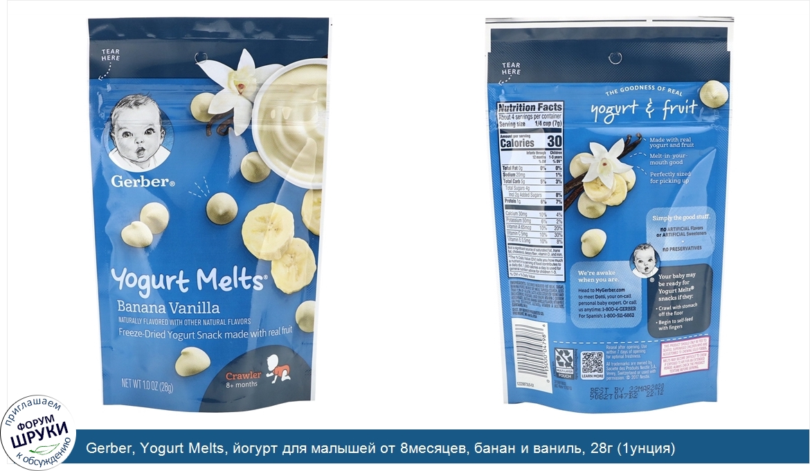 Друзья, если у вас есть отзыв/дополнение/комментарий/вопрос относительно Gerber, Yogurt Melts, йогурт для малышей от 8месяцев, банан и ваниль, 28г (1унция) - напишите его ответом в эту тему (это будет полезно всему сообществу в целом и вам в отдельности).