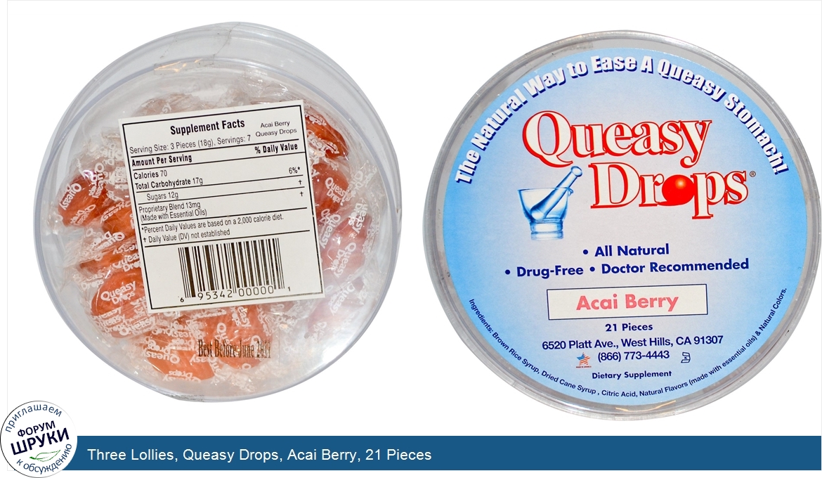 Three Lollies, Queasy Drops, Acai Berry, 21 Pieces