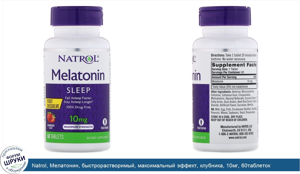 Natrol, Мелатонин, быстрорастворимый, максимальный эффект, клубника, 10мг, 60таблеток