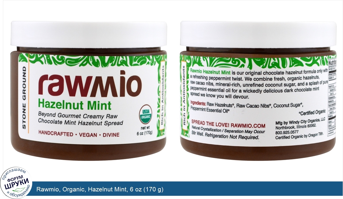 Stone Ground. Beyond Gourmet Creamy Raw. Chocolate Mint Hazelnut Spread. Handcrafted. Vegan. Divine. USDA Organic. Rich in Antioxidants. Certified Organic by Oregon Tilth. Rawmio Hazelnut Mint is our original cho...