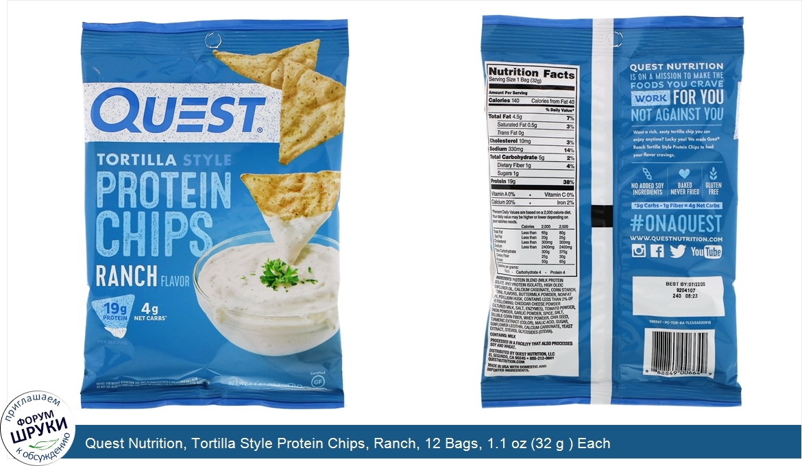 [DESCRIPT]Tortilla Style Protein Chips. 19 g Protein Per Serving. 4 g Net Carbs*. Kosher Dairy. Certified Gluten Free®. No Added Soy Ingredients. Baked Never Fried. Gluten Free. Quest Nutrition is on a mission to make the foods your crave work for you not against you. Want a rich, zesty tortilla chips you can enjoy anytime? Lucky you! We made Quest® Ranch Tortilla Style Protein Chips to feed your flavor cravings. *5 g Carbs - 1 g Fiber = 4 g Net Carbs.[/DESCRIPT]... (описание дополняется)