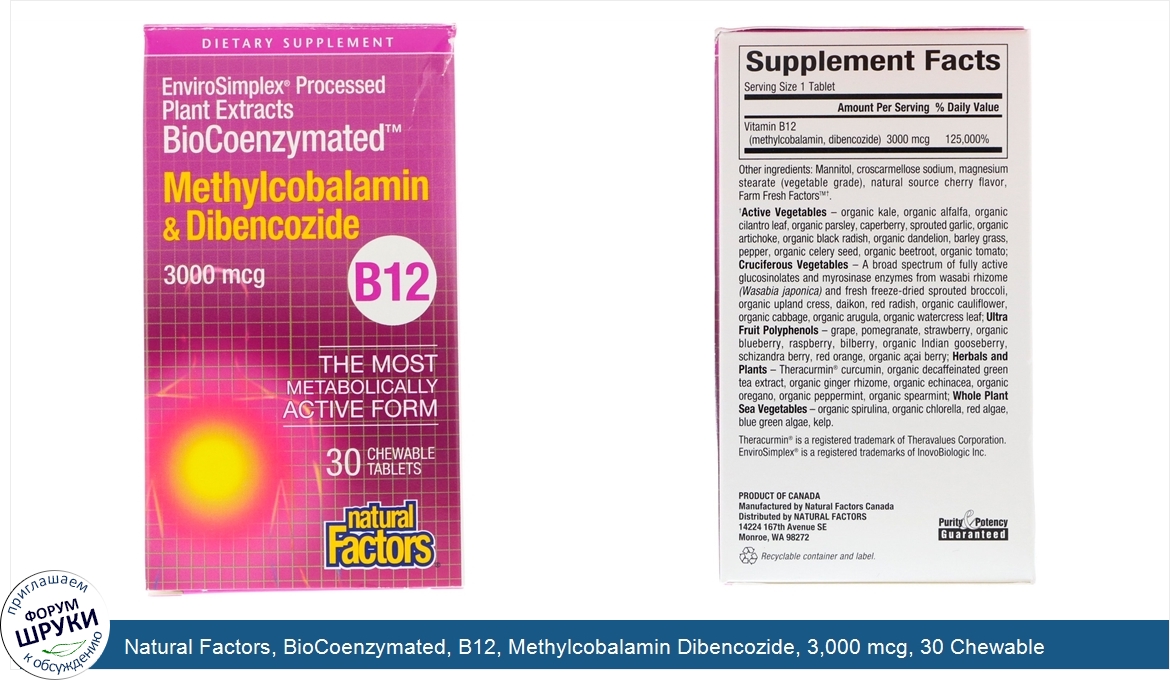 Друзья, если у вас есть отзыв/дополнение/комментарий/вопрос относительно Natural Factors, BioCoenzymated, B12, Methylcobalamin Dibencozide, 3,000 mcg, 30 Chewable Tablets - напишите его ответом в эту тему (это будет полезно всему сообществу в целом и вам в отдельности).