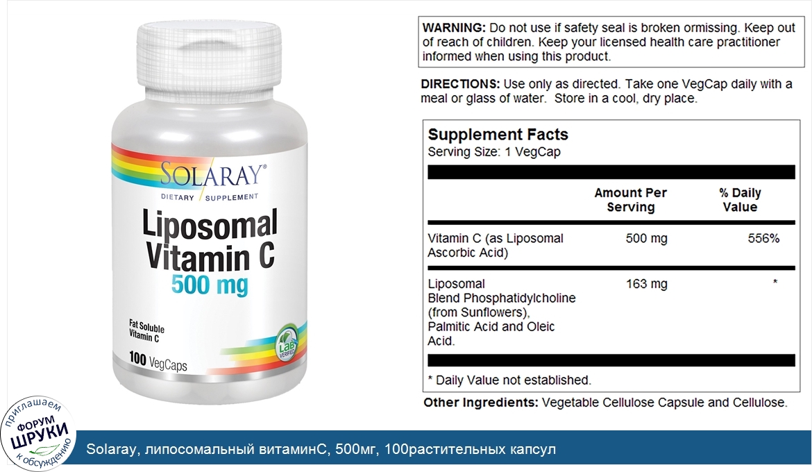 Друзья, если у вас есть отзыв/дополнение/комментарий/вопрос относительно Solaray, липосомальный витаминС, 500мг, 100растительных капсул - напишите его ответом в эту тему (это будет полезно всему сообществу в целом и вам в отдельности).