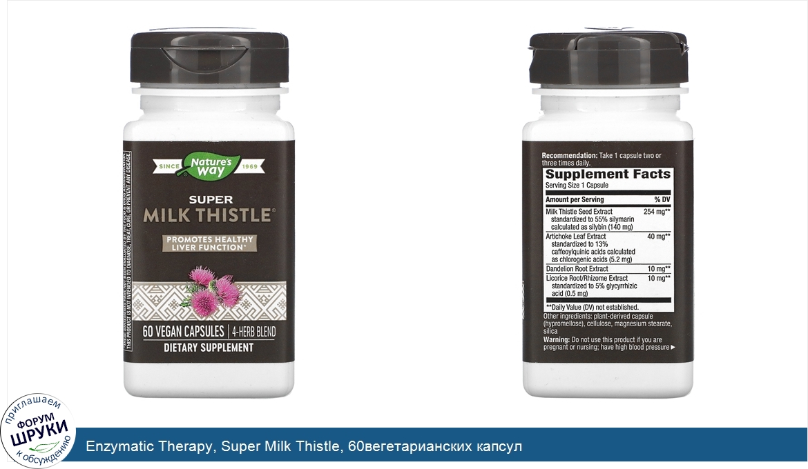 [DESCRIPT]Since 1969. Promotes Healthy Liver Function. 4-Herb Blend. Dietary Supplement. Vegan. Gluten Free. Quality Global Sourcing Bottled Tested in the USA. Milk Thistle has been used for over 2,000 years. There's a specific substance in Milk Thistle [silymarin] that has been shown to support liver function. Nature's Way. ® combines Milk Thistle extract with artichoke, dandelion, and licorice to promote healthy liver function.[/DESCRIPT]... (описание дополняется)
