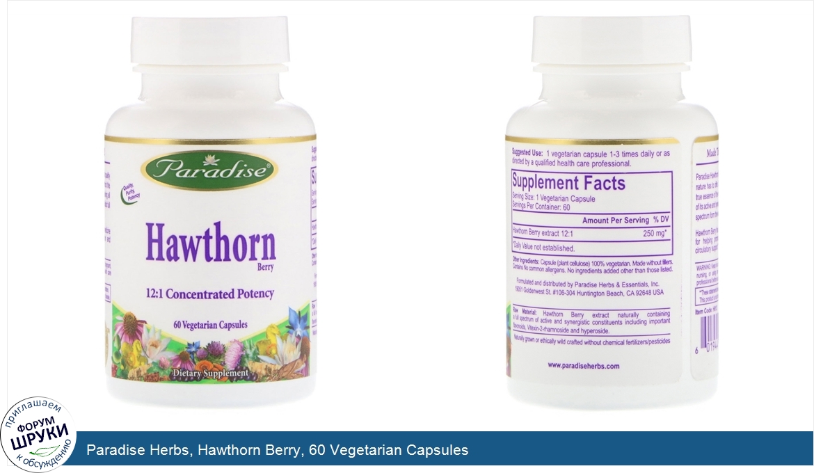 Друзья, если у вас есть отзыв/дополнение/комментарий/вопрос относительно Paradise Herbs, Hawthorn Berry, 60 Vegetarian Capsules - напишите его ответом в эту тему (это будет полезно всему сообществу в целом и вам в отдельности).