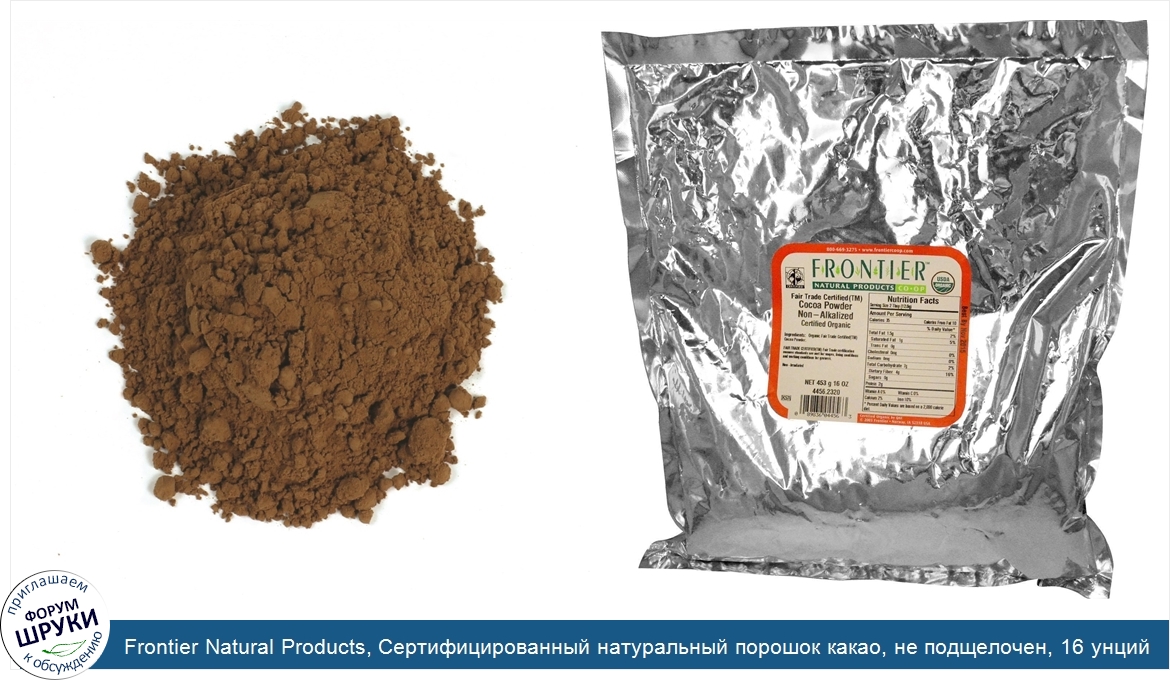 Друзья, если у вас есть отзыв/дополнение/комментарий/вопрос относительно Frontier Natural Products, Сертифицированный натуральный порошок какао, не подщелочен, 16 унций (453 г) - напишите его ответом в эту тему (это будет полезно всему сообществу в целом и вам в отдельности).