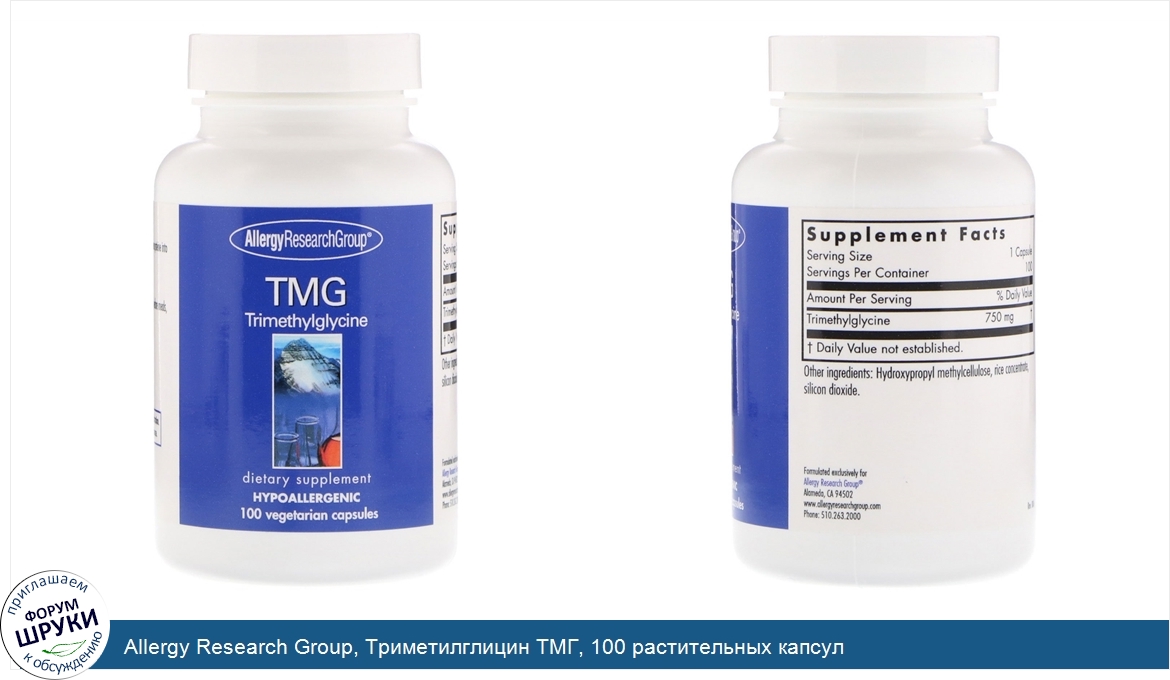 Allergy Research Group, Триметилглицин ТМГ, 100 растительных капсул