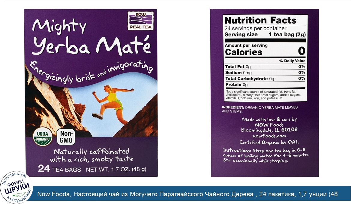 [DESCRIPT]USDA Organic. Non-GMO. Energizing Brisk and Invigorating. Natural Caffeinated with a Rich, Smoky Taste. Certified Organic by QAI. Premium Tea Bags with Our No-Staples Design. When tea aficionados need a natural and healthy boost of energy, the tea to turn to is yerba mate. The yerba mate plant is native to South America but is relished all over the world for its naturally occurring caffeine and rich, earthy, smoky flavor that's delightfully brisk and invigorating. We source only the highest quality ingredients so you can enjoy the most delicious, healthful tea every day. Because you are what you eat and drink, NOW Real Food and Real Tea have been committed to providing delicious, healthy, natural products since 1968. We're independent, family owned, and proud of it. Keep it natural. Keep it real.[/DESCRIPT]... (описание дополняется)