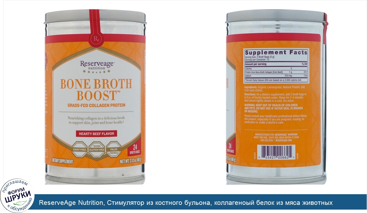 [DESCRIPT]Nourishing Collagen in a Delicious Broth to Support Skin, Joint and Bone Health. Dietary Supplement. Dairy Free. Tested Gluten-Free. Paleo Friendly. 24 Broth Bags. Savory, Grass-Fed Bone Broth. Reserveage Nutrition serves the health benefits of bone broth in natural flavors and individually wrapped broth bags for your convenience. Bone Broth Boost is a delicious, belly-warming way to promote healthier skin, joints and bones. The nutritious broth helps support natural collagen production, the building block of an active body. Served in a cup or bowl, our gourmet bone broth is a grass-fed collagen base rich in amino acid peptides, paleo-friendly and traceable for optimal benefits and quality. For a wholesome, savory treat any time of day, use hot water to maintain its rich nutritional profile. Our Gift To You. Lovely, reusable and recyclable, this canister maintains freshness and potency. Our Purpose. Inspired by the wisdom of nature and the healthiest cultures around the world, we travel the globe in search of the finest ingredients. Our goal is to provide, whenever possible, organic and natural ingredients in essential, science-based products that deliver life-changing benefits. Offering products that nourish your body, protect our planet and preserve traditional culture is core to our mission.[/DESCRIPT]... (описание дополняется)