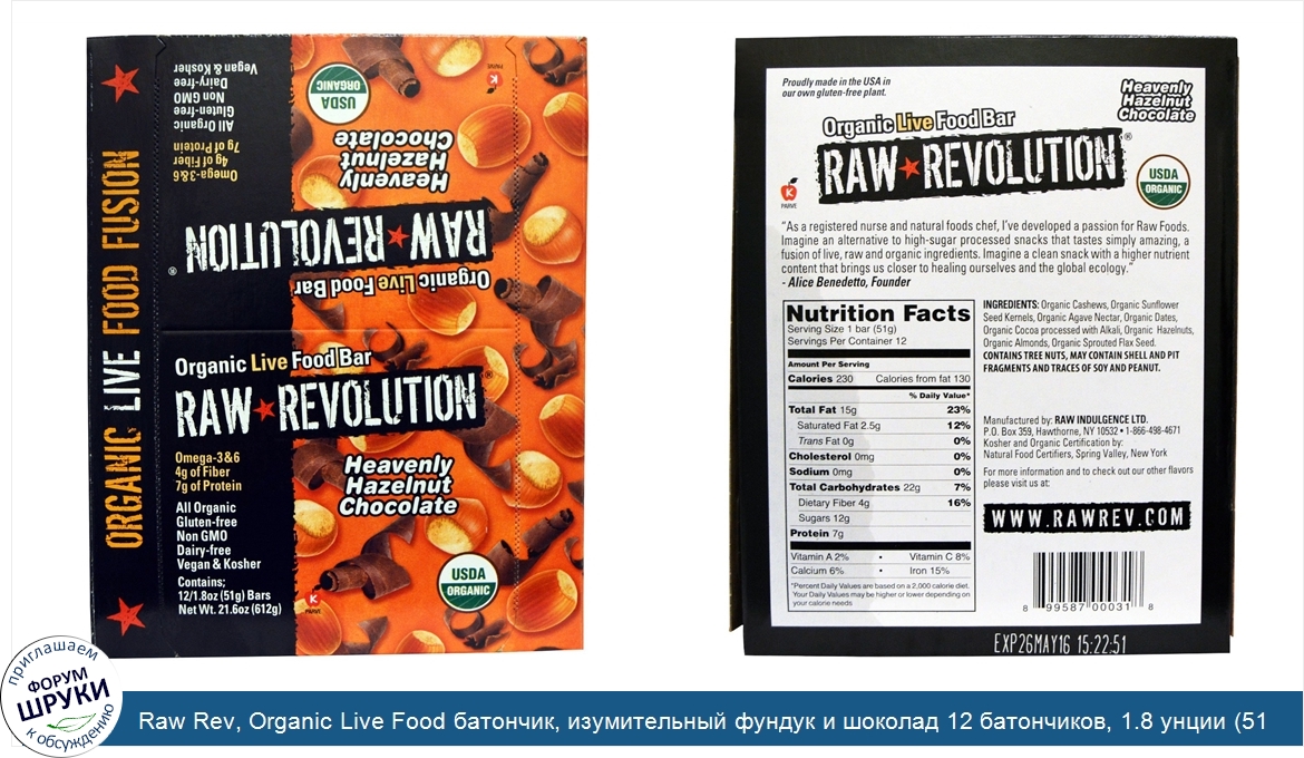 Raw Rev, Organic Live Food батончик, изумительный фундук и шоколад 12 батончиков, 1.8 унции (51 г) каждый