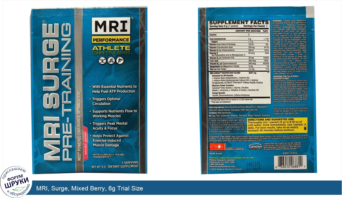 [DESCRIPT]NO2 Powered Endurance Optimization. Performance. Athlete Competitive Series. With Essential Nutrients to Help Fuel ATP Production. Triggers Optimal Circulation. Supports Nutrients Flow to Working Muscles. Triggers Peak Mental Acuity Focus. Helps Protect Against Exercise Induced Muscle Damage. With Clinically Tested Ingredients. 1 Serving. Dietary Supplement. UP-Regulated With Actinos. CarnoSyn Carnosine Synthesizer. MRI Surge delivers fast acting exercise support with an invigorating, "no crash" burst of steady energy. Even better, MRI Surge can be used pre and/or intra-workout for training support when you need it most. MRI Surge is formulated with ingredients that support optimal blood flow, energy, stamina, focus, and reduced muscle damage to help you do what you do best- train for results and compete to win. The core secret to the power of MRI Surge is a key, naturally occurring molecule called nitric oxide.[/DESCRIPT]... (описание дополняется)