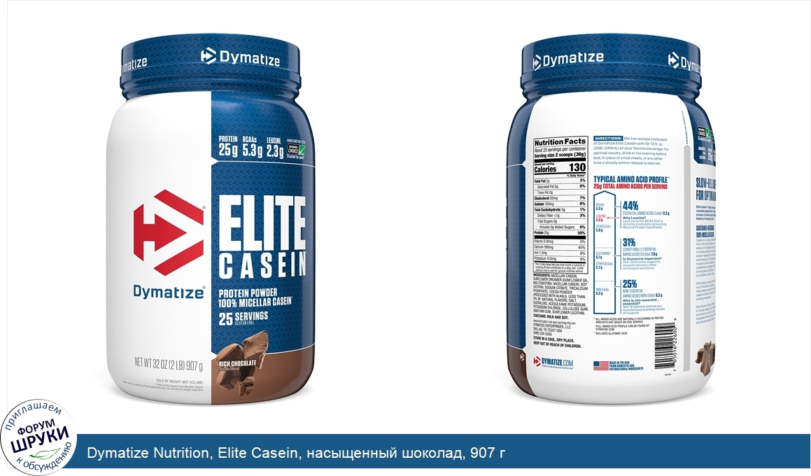 [DESCRIPT]Белок — 25 г. Аминокислоты с разветвленной цепью — 5,4 г. Лейцин — 2,3 г. Протеиновый порошок, 100% мицеллярный казеин*. 25 порций. Подтверждено отсутствие запрещенных веществ + не содержит глютена. Натуральные и искусственные ароматизаторы. Dymatize — совершенствование питания для физической активности. Принимайте Dymatize. Стандартный профиль аминокислот**. 25 г аминокислот на порцию. 44% незаменимых аминокислот (EAA): 11,3 г. BCAA - 5,4 г. Лейцин - 2,3 г –. Почему лейцин? Лейцин — это аминокислота с разветвленной цепью, которая непосредственно участвует в активации синтеза мышечных белков. Прочие незаменимые аминокислоты - 5,9 г. 31% условно незаменимых аминокислот: 7,8 г. Глутамин. †. - 5,1 г –. Важен ли глутамин? Да! Глутамин поддерживает восстановление мышц после интенсивных тренировок. Прочие частично незаменимые аминокислоты – 2,7 г. 25% заменимых аминокислот: 6,2 г. Заменимые аминокислоты - 6,2 г –. Почему важны. заменимые кислоты? Заменимые аминокислоты являются основным строительным материалом для роста мышечной ткани! Informed-Choice.org — нам доверяют спортсмены. Informed-Choice — это программа проверки качества, удостоверяющая, что пищевые добавки и/или ингредиенты с логотипом Informed-Choice были протестированы на отсутствие запрещенных веществ в антидопинговой лаборатории мирового класса LGC. Количества на порцию. Белок — 25 г. 130 калорий. Углеводы 2 г. Жиры 1,5 г. Сахар 0 г. BCAA 5,4 г. Лейцин 2,3 г. Комплекс Elite Casein помогает снабжать ваши мышцы необходимым количеством аминокислот, строительных блоков для роста мышц. Хорошо усваиваемый 100% мицеллярный казеин. Казеин — это уникальный протеин,получаемый из молока, который достаточно медленно расщепляется в системе пищеварения,что помогает улучшить усваиваемость и обеспечить медленное высвобождение используемых для роста мышц аминокислот. Поэтому если ваша цель — нарастить мышцы или предотвратить распад мышечного протеина в промежутках между приемами пищи или во время сна, то Elite Casein является отличным выбором. При производстве комплекса Elite Casein используется процесс перекрестной микрофильтрации, который помогает сохранить натуральное состояние казеина, важного протеина, участвующего в процессе роста мышечной массы. Elite Casein составлен по результатам внутренних исследований компании и научных специалистов, в ходе которых были тщательно отобраны ингредиенты, отвечающие строгим требованиям и спецификациям. Все вкусовые варианты комплекса Elite Casein разработаны нами собственными силами. Мы хотели, чтобы процесс набора мышечной массы имел для вас приятный вкус. Быстрорастворимые формулы обеспечивают легкость смешивания, давая вам возможность добиться вкуса мирового уровня и однородной насыщенной консистенции для каждого казеинового коктейля. Реальные научные разработки и качество. Протеины Dymatize формулируются на основе новейшей науки и подвергаются испытанию в университетских исследованиях и в элитных профессиональных учебных заведениях. Протеины Dymatize в порошке всегда производятся на предприятиях с сертификатом GMP, а также сертификатом для изготовления спортивных препаратов, что означает, что все ингредиенты и готовый продукт тщательно тестируются на чистоту и безопасность. Они протестированы на отсутствие запрещенных веществ компанией Informed-Choice (www.informed-choice.org). Этика протеина Dymatize. 100% протеина, заявленного на порцию,