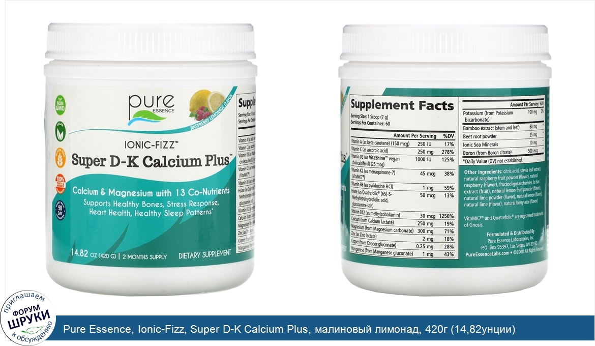 Друзья, если у вас есть отзыв/дополнение/комментарий/вопрос относительно Pure Essence, Ionic-Fizz, Super D-K Calcium Plus, малиновый лимонад, 420г (14,82унции) - напишите его ответом в эту тему (это будет полезно всему сообществу в целом и вам в отдельности).